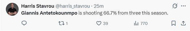 NBA記者哈里森:揚尼斯本賽季的三分球命中率高達66.7%.
