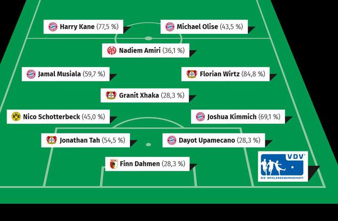 德國(guó)職業(yè)球員工會(huì)德甲賽季最佳陣:凱恩、維爾茨、奧利塞在列