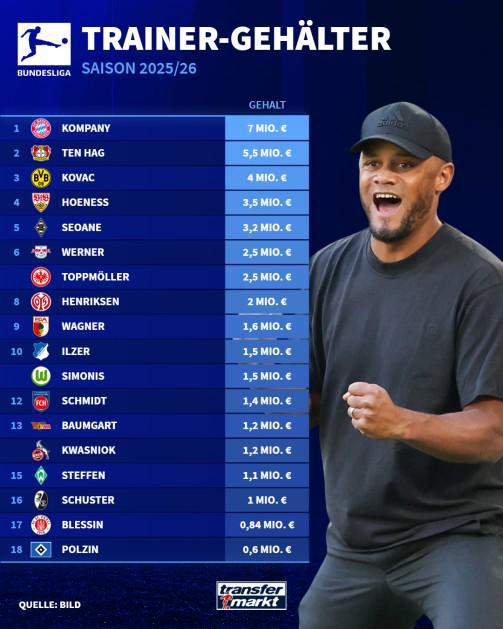 德轉(zhuǎn)列德甲教練年薪榜:孔帕尼居首,滕哈格第二,科瓦奇第三